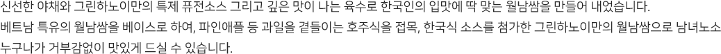 그린하노이의 목표는 가맹점 수익의 극대화입니다. 시장의 변화를 능동적으로 대처하고 미리 준비하는 자세로 고객들의 입맛을 사로잡고, 발길이 끊이지 않도록 유도하여 각 지역의 대표맛집, 그 지역의 랜드마크가 될 수 있도록 노력하겠습니다.